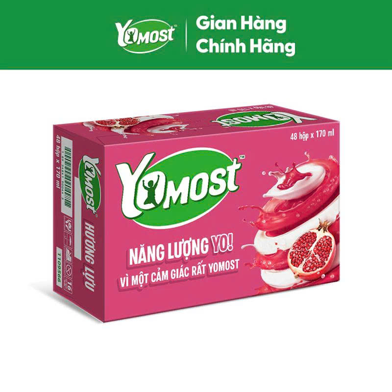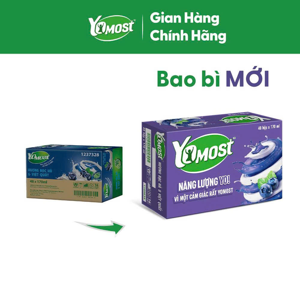 Thùng 48 hộp 170ml Yomost sữa chua lên men tự nhiên vị Bạc Hà – Việt Quất hoặc Lựu, chua ngọt mát lạnh, thích hợp giải khát mỗi ngày. 🥛🍇🍹